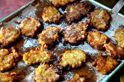 5. Use a sieve to dust the latkes with confectioners’ sugar. These are best eaten fresh but can be reheated in the oven. Store them in the fridge for up to three days or freeze them for up the three months. To reheat, place frozen latkes onto a cookie sheet and bake them in a 400 degree Fahrenheit (200 degree Centigrade) oven until crisp.
