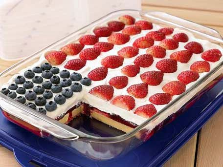2.Meanwhile, line bottom of 13x9-inch dish with cake. Add sliced strawberries and 1 cup blueberries to thickened gelatin; stir gently. Spoon over cake. Refrigerate 4 hours or until gelatin is firm.