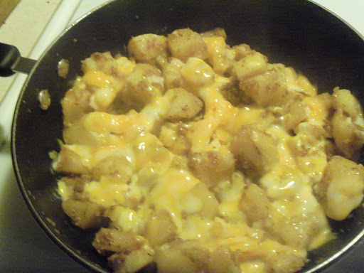 In a large fry pan, pour 1/4 cup olive oil. Fry potatoes, onion and Joes Stuff until potatoes are tender Melt cheese over potatoes until melted.
