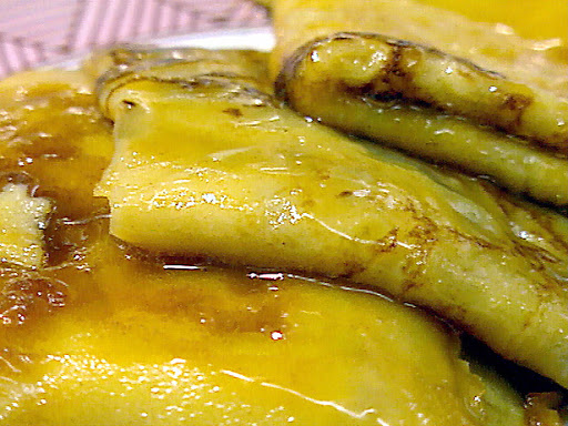 In a large frying pan or chafing dish, melt butter add sugar and orange peel, cook until mixture bubbles.