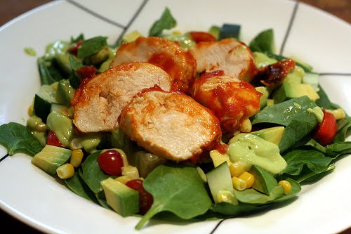 To plate the salads - place mixed greens on a plate. Lay the sliced chicken on top of the greens. Top with tomatoes, cucumbers, corn, and fried onions. Place a few warm potatoes on the side. Drizzle entire salad with avocado vinaigrette and ranch dressing.