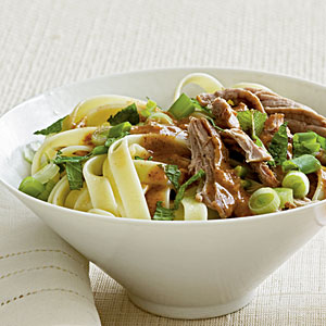 4. Combine almond butter, 2 tablespoons pasta water, remaining salt, soy sauce, vinegar, ginger, and chili garlic sauce. Divide pasta evenly among 4 bowls; top evenly with sauce, pork, onions, and mint.