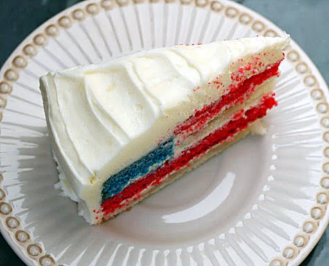 Place the white inner circle on top of the uncut red layer, inside the ring of blue. Frost, and top with the red inner circle. Frost the entire cake and voila, it’s a flag cake!
