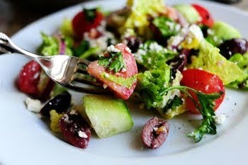 Pour dressing over salad ingredients, then add salt and pepper. Toss with tongs or clean hands. Just before serving, top with additional feta and squeeze a little lemon juice over the top.