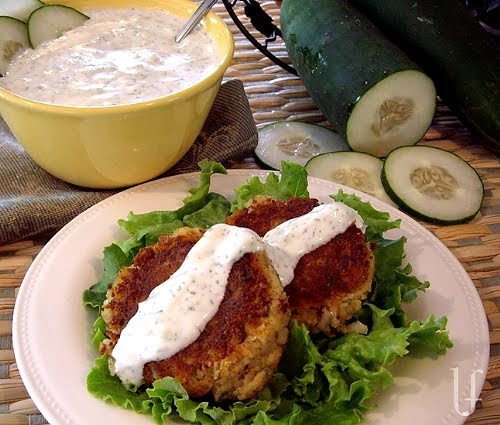 Heat a small amount of oil in a nonstick frying pan, or spray with nonstick spray. Heat pan over medium-low. Form patties from 1/8 cup of falafel mixture. These are soft so keep them more rounded, as they will flatten slightly when turned. Fry patties until golden brown on each side. Serve with Tzatziki sauce. Makes about 14 patties.