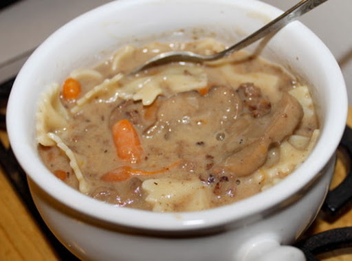 Ground Beef Stroganoff is one of our favorite meals. It definitely counts as comfort food and this time of year, it one of the recipes I turn to the most when I’m just not sure what to make or when I’m short on time. And then there’s soup. My love for soup and the fact that I could eat it for every single meal is no secret around these parts. I was debating back and forth between those two options when I was trying to decide what to make for dinner. I eventually decided that I’d split the difference and experiment with a ground beef stroganoff soup. Plus I thought it would be a great meal that was both comforting and warming. We were thrilled with the results. Eric thought that it was some of the best soup that I’ve ever made. I don’t know if I’d go that far (I tend to be partial to the creamier soups, like Loaded Baked Potato or Vegetable Curry), but it was definitely yummy! I tossed in some carrots to make it a complete meal. I didn’t have any egg noodles on hand, which would have been most appropriate, but the bow-tie pasta I had on hand worked just as well.