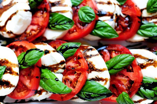 When you're ready to serve, arrange tomato and mozzarella slices on a platter. Arrange basil leaves between the slices. Drizzle olive oil over the top of the salad, getting a little bit on each slice. Do the same with the balsamic reduction, making designs if you want. Store extra balsamic reduction in fridge for a later use.