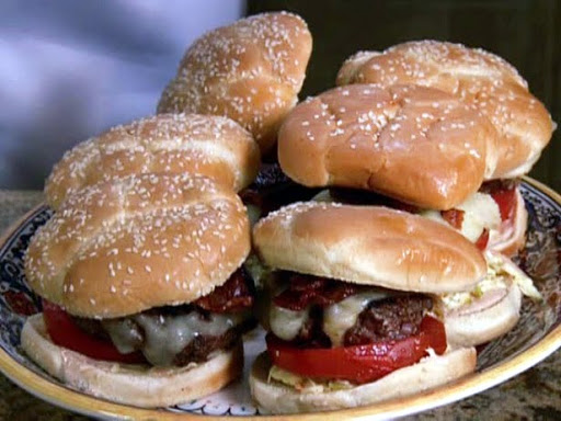 Build your burgers by topping with the bacon, Secret Sauce, coleslaw, and tomatoes. Add onion rings if desired.