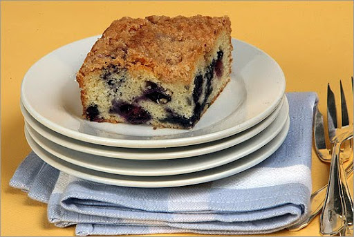 5. Remove the bowl from the mixer stand. With a rubber spatula, fold in blueberries. Transfer the batter to the pan and smooth the top. Sprinkle the topping over the cake.