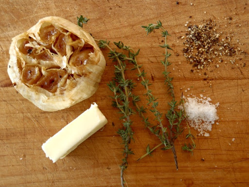 * Remove the papery outer layer from the head of garlic. Slice approximately 1/2" off the top to expose the cloves. Place in a small baking dish and drizzle oil over. Sprinkle lightly with salt. Cover with foil and roast for 40 to 45 minutes. Allow to cool slightly then squeeze garlic from cloves into bowl and mash with the oil remaining. (Can be done earlier in the day) Slice baguette and spread with garlic mixture and wrap in foil to heat in oven for 15 or so minutes at 300°.