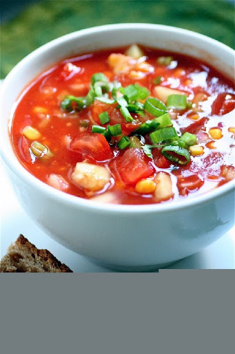 1. In a large bowl, combine the tomatoes, corn, jalapeno pepper, cucumber, scallions, red onion, and garlic, tossing to combine.