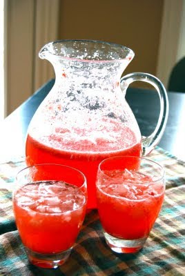 Cut tops off of strawberries and cut each berry in half, then add to food processor or blender until chopped very fine. Add chopped strawberries & 3 tbsp. grenadine to a large pitcher, stir to combine. Taste with a small spoon, add another tbsp. grenadine if necessary. Add in lime juice, then the soda. Stir to combine.