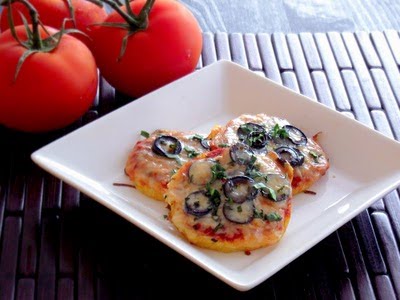 Remove the polenta from the skillet and place on a paper towel-lined plate to drain the excess oil. Add about a teaspoon of sauce to each polenta slice, top with a teaspoon or so of shredded cheese, then add the olives & mushrooms. Return the mini pizzas to the skillet and cover, cooking for another 2-3 minutes, or until the cheese has melted. Garnish with fresh chopped basil, serve with a nice salad, and enjoy!