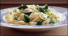 For this dish, I like to use conchiglie pasta; its shell shape allows the individual pieces of pasta to capture and hold bits of the garlic and broccoli.
