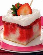 In a large bowl, dissolve gelatin in boiling water. Stir in strawberries. Using a sharp knife, make a diamond pattern in the top of the hot cake; immediately pour gelatin mixture over cake. Cool on a wire rack.