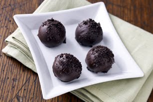 SHAPE into 48 (1-inch) balls. Dip in melted chocolate; place on waxed paper-covered baking sheet. Sprinkle with remaining cookie crumbs.