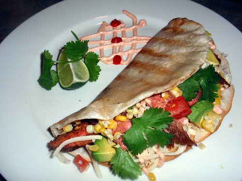 Now you're ready to assemble your steak taco. First add some of the sliced steak covering half of your tortilla. Top with corn, tomato, avocado, shredded cheese, and cilantro. Squirt some spicy sauce on top. Fold over the tortila and serve your steak taco with a wedge of lime and hot sauce for some added zing.
