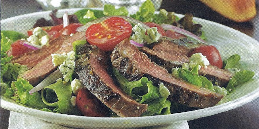 6.) Mound some of the salad on each of the four serving plates. Top with steak and crumbled blue cheese. Serve with garlic bread or a crusty baguette.
