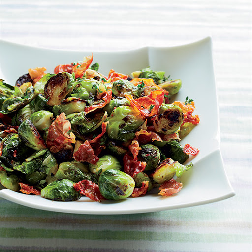 Coarsely chop the garlic and tear the prosciutto into bite-size pieces, then fold them into the brussels sprouts. Season with salt and serve with lemon wedges.