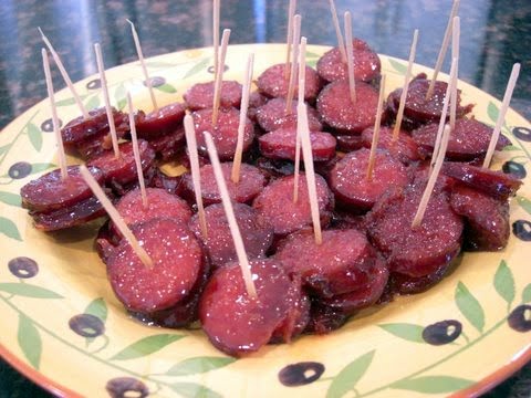 Slice kielbasa into thin slices. Place in 9X13 glass baking dish. Pour jar of apple jelly over the kielbasa. Mix together.