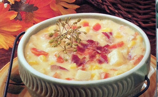 Stir in the milk, corn and pepper. Cook 5 minutes longer. Combine the flour and cold water until smooth; gradually whisk into soup. Bring to a boil; cook and stir for 1 - 2 minutes or until thickened. Remove from the heat; stir in cheese until melted. Sprinkle with bacon.