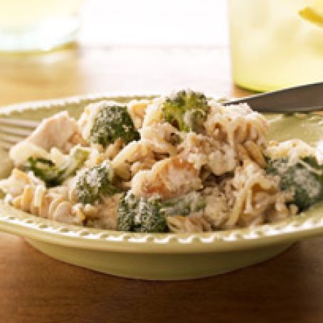 Drain pasta and broccoli. Add to chicken mixture; mix lightly. Spoon into 8 inch square baking dish; cover.