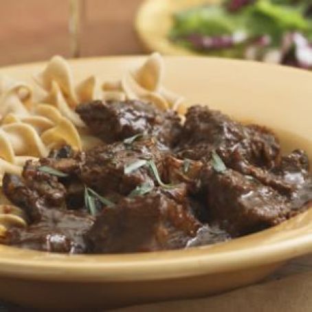 5.Skim or blot any visible fat from the stew. Transfer the beef and mushrooms to a bowl with a slotted spoon. Return the pot to the stove and bring to a gentle simmer. Cook until the sauce just coats a spoon. Stir the beef, mushrooms and the remaining 1/2 teaspoon salt into the sauce and heat through, about 1 minute. Serve garnished with tarragon (or dill), if desired.