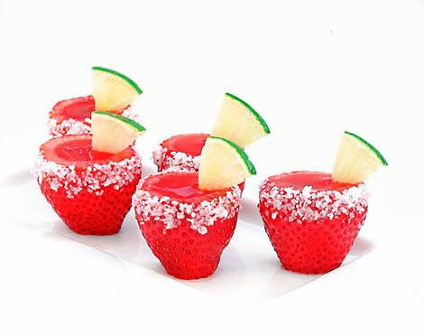 Pour final Jell-o mix into strawberries and chill overnight. Dip your finger in water or use a moistened brush to wet the edge of the strawberries, dip and rotate the strawberries in salt to rim. Garnish with cut lime triangles to finish.