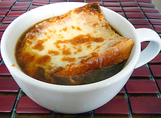 5. To serve: Adjust oven rack 6 inches from broiler element and heat broiler. Set individual broiler-safe crocks on baking sheet and fill each with about 1¾ cups soup. Top each bowl with 1 or 2 baguette slices (do not overlap slices) and sprinkle evenly with Gruyere. Broil until cheese is melted and bubbly around edges, 3 to 5 minutes. Let cool 5 minutes before serving.