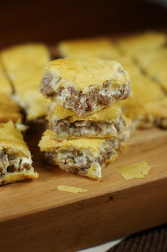 Unroll one package of crescent rolls and place on a baking sheet. With your fingers, gently press the seams together to seal them. Spread the sausage mixture evenly over the crescent roll dough, leaving about a 1/2-inch border along the edges.