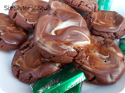 Take sheet out of oven and while the cookies are still very hot, place an Andes Mint on top of each cookie. In about 5 minutes, the mint will be melted. Take a spoon and smooth out each mint like frosting.