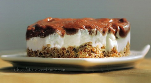 3. Combine all ingredients for chocolate pudding in a food processor or high-powered blender and blend until very smooth. Pour over cream filling and spread evenly with a spatula. For best results, refrigerate for a few hours before cutting and serving so dessert becomes more firm.