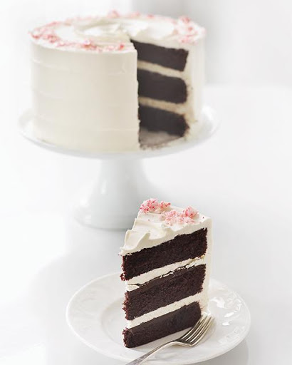 18. To assemble the Wintermint Cake, place 1 cake layer on a serving platter.