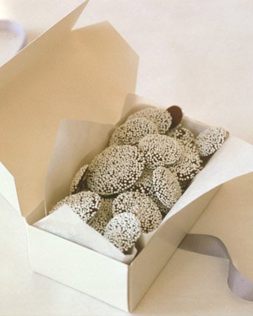 Spoon the melted chocolate in nickel-size circles onto prepared baking sheet. Cool for 20 minutes; sprinkle with sugar beads. Let nonpareils harden in a cool place for 4 hours before serving.