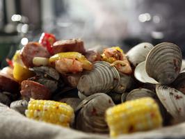 In a large pot with a lid, add the food in layers--the kielbasa first, followed by the corn, clams and shrimp. Distribute the coriander, cumin, red pepper flakes, salt, pepper, chiles, bay leaf, garlic, lemon and onions over the top. Pour in the wine, cover and cook over high heat until the clams open, 20 to 25 minutes.