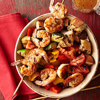 Thaw shrimp, if frozen. In a medium bowl combine oil, vinegar, lemon juice, garlic, salt, and black pepper. Thread shrimp onto six 12-inch wooden skewers.* Brush shrimp with about 3 tablespoons of the oil mixture, reserving the remaining mixture.
