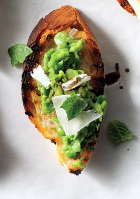 Spread about 1 tablespoon mixture over each toast. Garnish with shaved Parmesan, torn mint, and a few drops of balsamic vinegar.