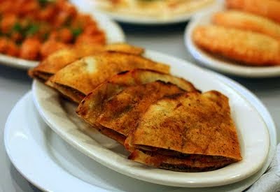 Spread a thin layer of tomato paste on one side of the inside of the pita bread. Open up the quartered bread pieces and spread a heaped tablespoonful of meat mixture in a thin layer into one side of the bread and press down to close.