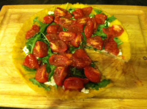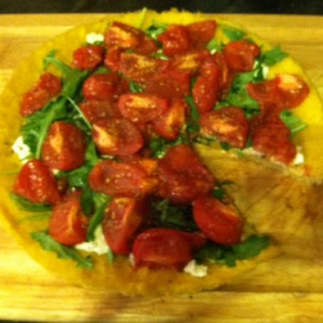 Polenta tart with goat cheese, arugula and roasted Campari tomatoes