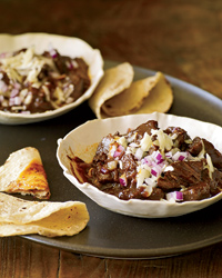 Add the onion and garlic to the casserole and cook over moderately high heat until softened, about 3 minutes. Add the coriander, cumin, cinnamon and cloves and cook until fragrant. Add the chile-ale mixture and the chicken stock and bring to a simmer, stirring. Cover partially and simmer over low heat until the meat is very tender and the sauce is slightly reduced, about 2 hours.