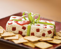3.Refrigerate it for at least 3 hours. Before serving time, set the unwrapped block of cheese on a platter and decorate it with a scallion bow and red pepper polka dots and gift tag.