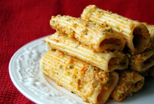 Drain the pasta but retain about a cup of the liquid. With the food processor running, slowly thin the tomato mixture with the pasta cooking liquid until you get the consistency you desire. Dump your hot pasta into the skillet and add the sauce mixture. On a low heat setting, toss to combine pasta with sauce while bringing everything up to temperature, re-season with salt and pepper if necessary and serve immediately.
