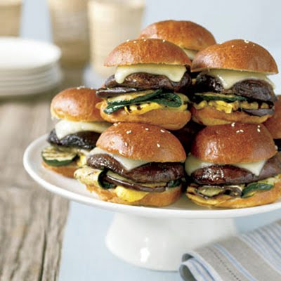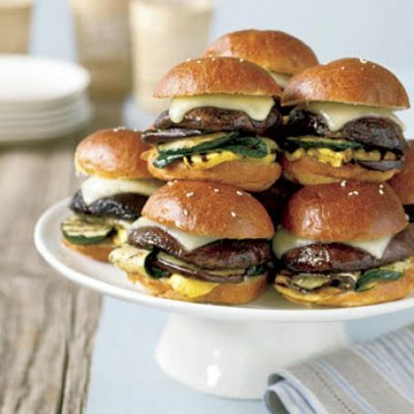 3.Transfer to a baking pan. Heat broiler to low. Split the buns, brush the tops with the sesame oil, and sprinkle with sesame seeds. Layer the squash, zucchini, eggplant, and mushroom on the bottom bun halves. Top each with cheese and broil until cheese melts, about 1 minute. Top with remaining seeded bun tops and serve hot.