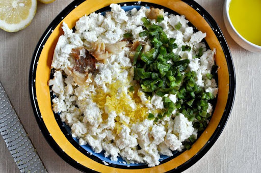 In a large bowl, crumble the feta bricks. Add chopped jalapenos, the zest of half a lemon, and the juice of half a lemon. Squeeze the roasted garlic out of the bulb directly into the feta. Add 1/4 cup of olive oil and mash with a fork. You want the feta to be a bit “wet” – I can best describe it as a cross between a spread and a dip. There is no right or wrong – make it however you’d like. Taste the feta and season with salt and pepper. Serve with pita chips, warm pita or naan, or spread it on sandwiches. Store it in the fridge for up to one week – I find that I like it best at room temperature, so allow it to sit out for about 30 minutes before serving. We also think it would be great with some kalamata olives.