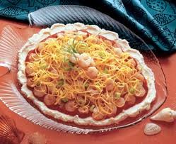 Spread chili sauce over top of mixture. Spread small shrimp on top of that. Sprinkle dip with grated sharp cheese.