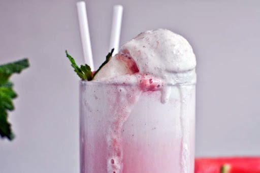 In a blender, combine the watermelon, mint and water. Blend and pulse quickly, just until watermelon has broken down – this should only take about 30-60 seconds or so. The blending will “de-carbonate” the water a bit, but it should still have some fizz. Pour mixture through a fine mesh strainer into a large bowl, glass or measuring cup in order to remove the seeds. Fill two glasses with vanilla ice cream and pour watermelon soda over top. Garnish with additional fresh mint.