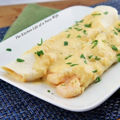 4. Spoon some sauce (without any shrimps) into a greased 9 x 13 baking dish and spread it evenly along the bottom. Fill each tortilla by spooning about 2 tablespoons of the shrimp (and sauce) down the center and roll it. Place each seam-side down in the dish and once filled, ladle more sauce over top.