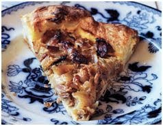This is fantastic either hot or cold and it reheats in a 350°F (180°C) oven for 5 to 10 minutes. Cut in slices and serve as a first course with a small salad or cut in smaller slices as an hors d’oeuvre. Buy frozen puff pastry that comes in one block rather than the already rolled-out type, as it is not big enough for this tart. Use a pizza pan to give a crisp pastry base.