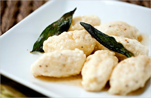 2. Put the butter in a large skillet over medium heat. When it melts and turns a nutty brown color, add the sage. While it fries, drop the ricotta mixture by the rounded tablespoon into the boiling water, working in batches of six or so at a time so as not to overload the pot.