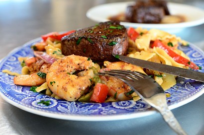 Mound pasta on plates and nest a warm steak in the middle. Arrange shrimp around the edge of the plate. Sprinkle with a little more minced parsley and serve!